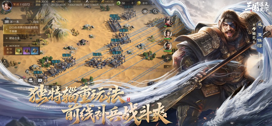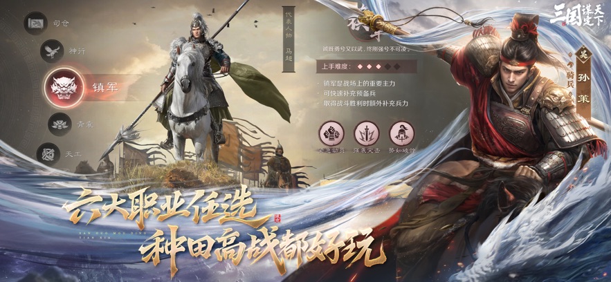 身处三国乱世,你可以扮演运筹帷幄的奇佐、征战沙场的镇军、出奇制胜的神行、悬壶济世的青囊、屯田发育的司仓和巧制机关的天工。六大职业合理配合是制胜关键,不同的职业技能可以改变真实的沙盘地形、补给、战术、局势,你可以摆下箭塔拒马投石车徐图推进,也可以火烧连营八百里;可以奇袭粮道以弱胜强,也可以陷阱诡计防守反击……你可以和盟友一起,群策群力谋定天下,利用一个个精彩的职业策略组合,在沙盘上大放异彩,体验完全不一样的SLG乐趣,在这里你甚至还可以还原火烧乌巢,奇袭子午谷,赤壁之战等等经典历史。