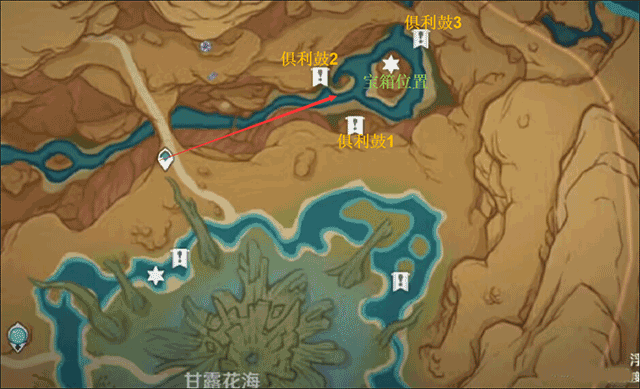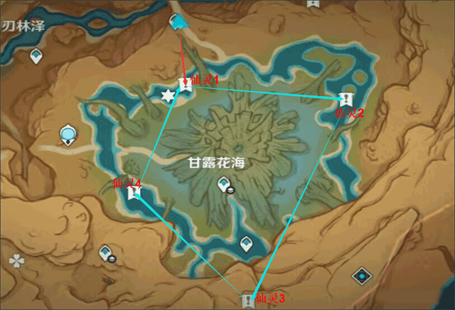 甘露花海四周有4只仙灵,对应有4处灵光游蜉挑战(完成对应挑战后仙灵才能移动),每只仙灵都会带我们去找下一只仙灵所在的位置,即“仙灵1→仙灵2→仙灵3→仙灵4→仙灵1”,无论从哪只仙灵开始都可以。当开完最后一只仙灵归位后的宝箱时,会强制转视角看向一道绿色传送门,进入传送门开启收集草微粒的挑战,挑战完成后出现华丽宝箱(挑战时间充裕,不用慌)。