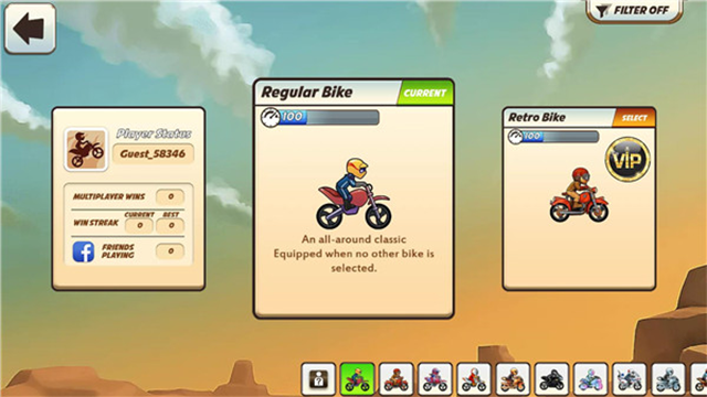 可以自由控制车速,运用重力感应控制车的平衡,赛道设计合理富有挑战性,关卡量足够,玩起来带感,跟随关卡的解锁,骑手的形象也会改变。