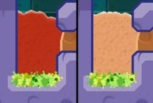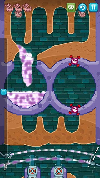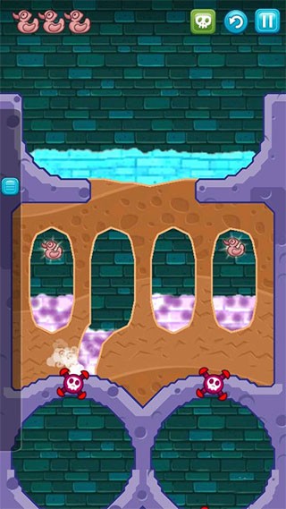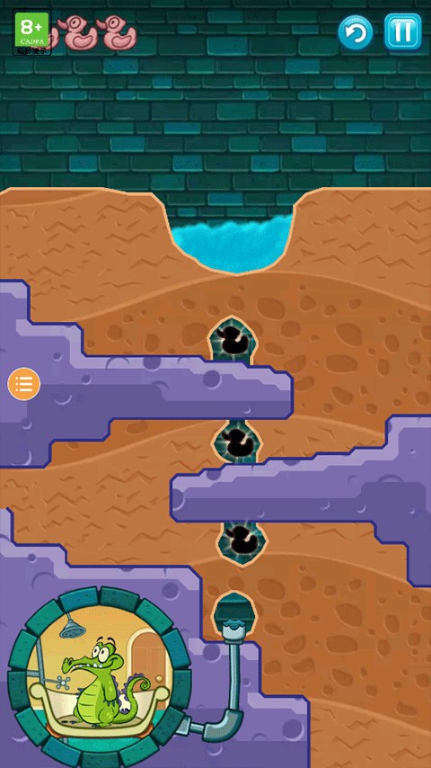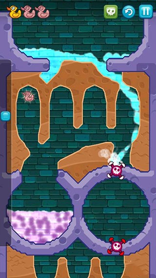 8、挖出如图一样的路来,将清水引下,收集到最后一只鸭子,最后将水引入小顽皮的浴室即可过关。