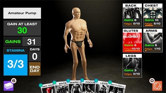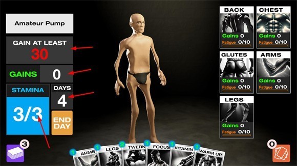 5、每张训练卡牌都需要消耗一定能量,具体消耗值可在卡片左上角查看。若当日能量用尽,需点击“end day”进入新的训练日程。