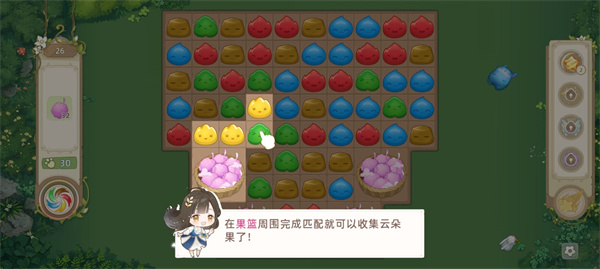 【云朵果】一般会以7-8个的数量出现在果篮里,在果篮周围完成匹配就可以收集云朵果,收集小建议:花弹一次爆炸最多可收集2个云朵果(不与其他果篮相邻的情况下),在果篮附近三个消除最多也可以收集2个云朵果,所以一般紧盯果篮,不被其他元素干扰都可以顺利过关~
