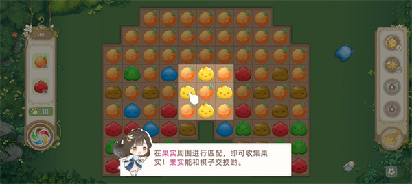 第40关之后就会出现【果实】,在果实周围进行匹配,即可收集果实,果实能和各种元素进行交换,消除起来是最简单不过了,唯一的难处就是果实数量众多,开局可匹配的元素不多。