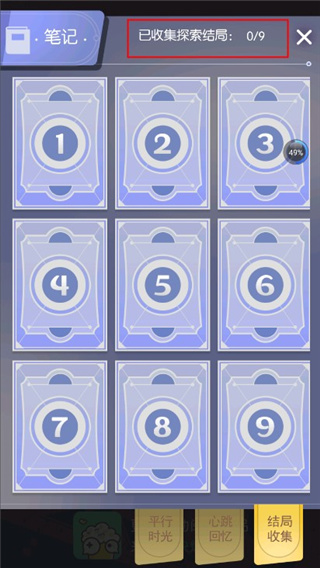 6、其实在这个“结局收集”就已经暗示玩家了,这个游戏总共是有九种结局的,也就是说你每一次游戏的结果都是有可能不同的;