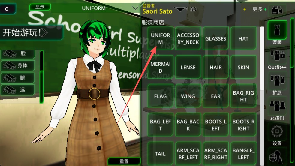 1、打开校园女生监督会汉化版游戏,点击【套装】