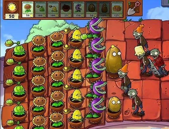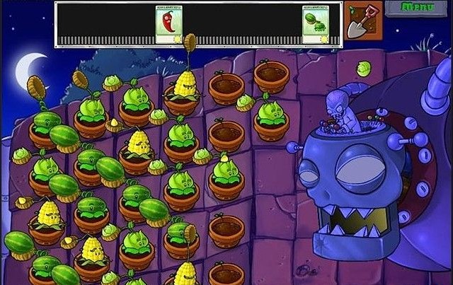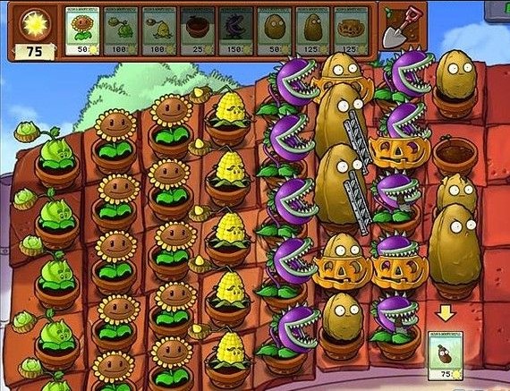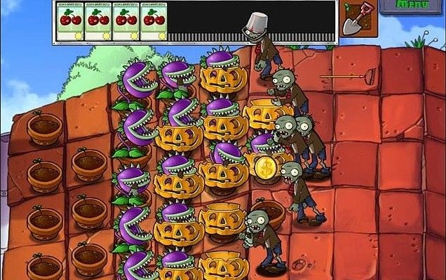 这一关开始是在屋顶上了,由于屋顶有隆起的部分,因此后面几排放豌豆射手一类的水平射击植物就没有用了,但靠近隆起部分的地方是可以放豌豆系的植物的。不过像卷心菜这样的依靠弧线投掷进行攻击的植物就大有用处了。