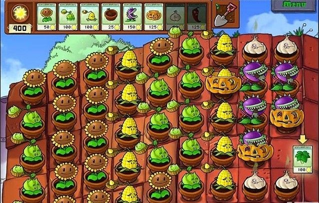 先把阵型摆出来一排卷心菜,一排玉米,一排食人花,一排墙果……