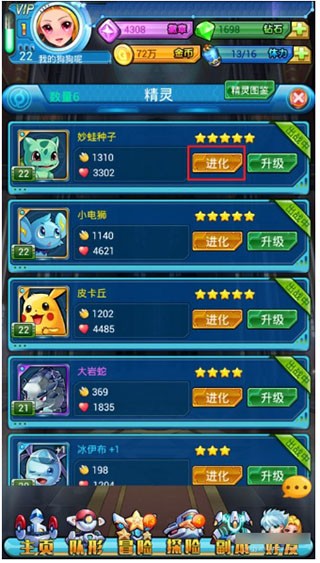 5、精灵进化需要吞噬一张相同星级的精灵卡和大量的金币