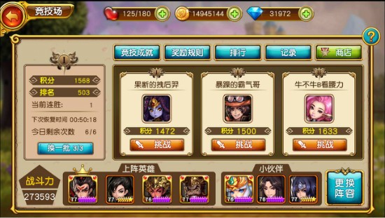 2、扬长避短巧获积分:玩家选择战力低的对手较为容易获得胜利,提高胜率。当你觉得面临的3位对手均无法战胜,你可以再次刷新,直到找到比你弱小的对手,更为容易获得积分。需要注意的是,换对手的次数有限,超出限制次数需要耗费钻石;