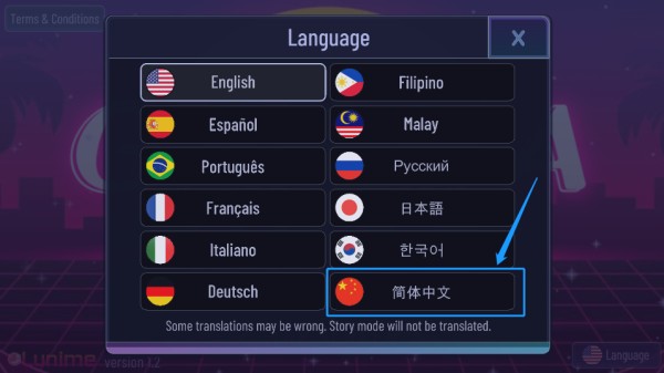 1、下载安装好加查超越游戏后运行游戏,游戏默认是英文状态的,我们先设置中文,点击右下角“language”