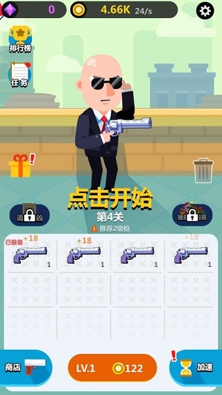 除上述外的基本闯关玩法外,这款游戏还有休闲的合成要素,对于合成休闲游戏已经成为了当下休闲市场不可或缺的重要因素之一,在游戏的主界面中,玩家可通过购买枪支,并将相同两个等级类型相同的枪支进行合成,由此将提升枪支等级,对于后续关卡的难度挑战,有着非常重要的作用。