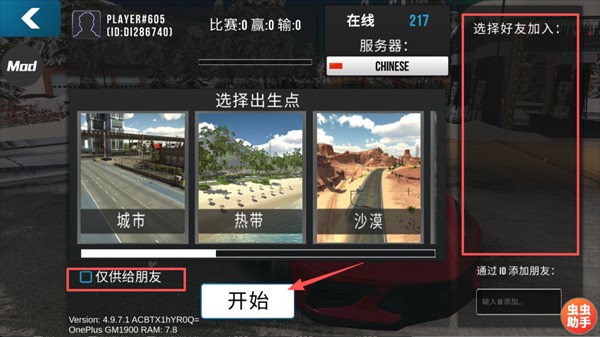 选择城市、热带或沙漠等出生地图,若勾选【仅供给朋友】可创建私密房间,设置完成后点击【开始】进入联机服务器。