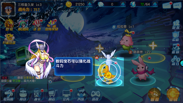 数码兽养成:玩家可通过战斗、完成任务、参与活动等方式获取经验和道具,提升数码宝贝的等级、进化、升星、解锁基因等,让数码宝贝变得更加强大。不同的数码宝贝在进化后会获得不同的形态和技能,实力也会大幅提升。