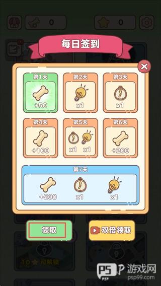 1、进入整理来解压游戏,先进行每日签到可领取骨头,骨头可用于跳过关卡