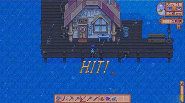 1. 第一步,把鱼竿放置在物品栏上方,面向水面,轻点屏幕,接着控制好力度甩竿,观察鱼钩的落点。要是出现一个“!”标志,同时还显示“hit”标志,就表明钓到鱼了,此时可以收杆。