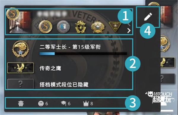 2、位置2:经验军衔、经验等级和经验值、竞技模式段位、搭档模式段位。