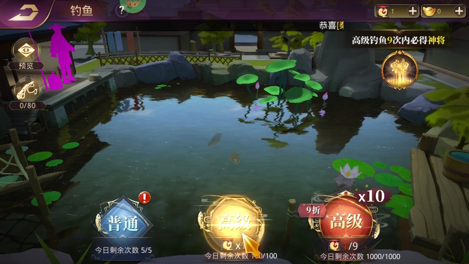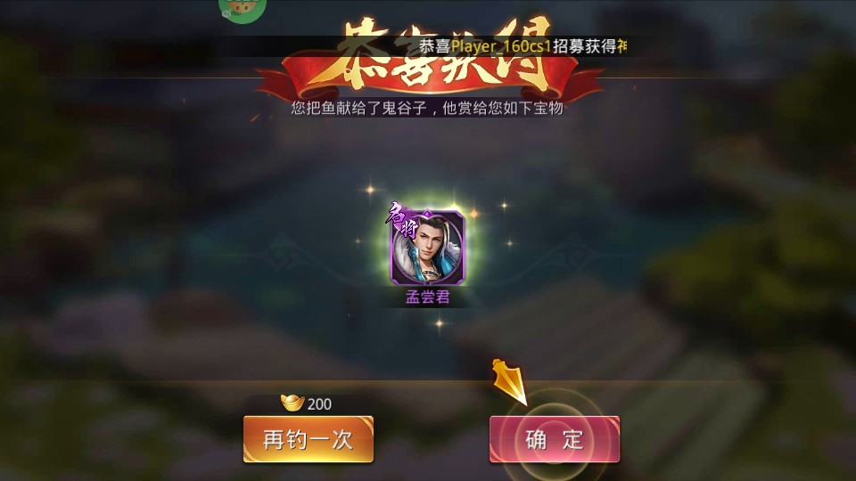 4、在游戏的鱼塘系统中,玩家可以进行钓鱼,每一次抛竿都是一次招募武将的机会。