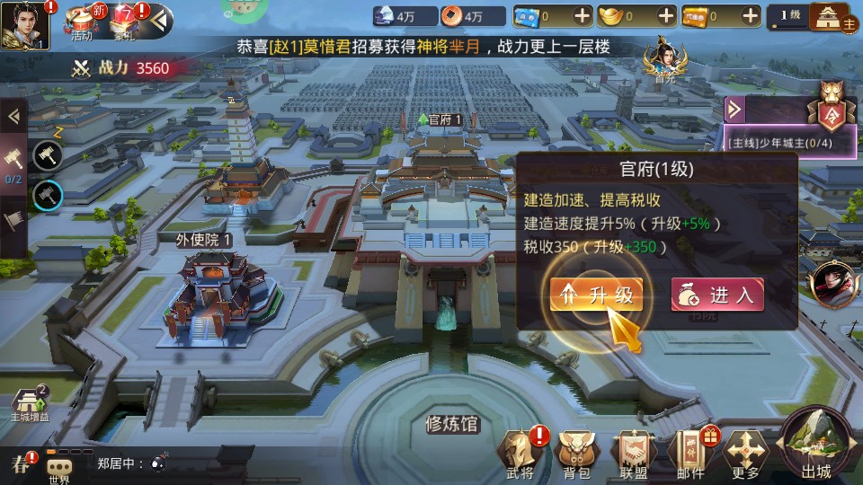 1、城池建设:玩家需要完善自己的城池建设,提升各种建筑的功能,如官府可以加速建造、提高税收。