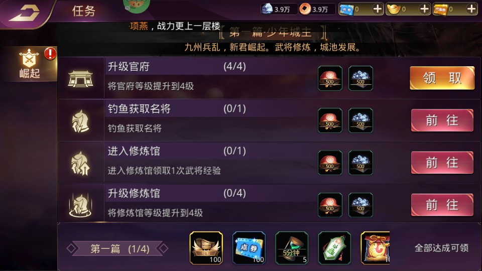 3、完成官府升级任务后,还可领取丰厚奖励,加快发展速度。