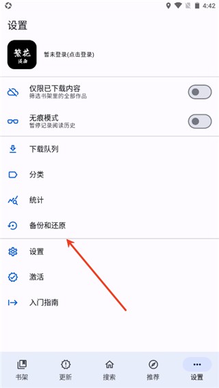 4、点击创建备份后,还能选择备份的作品类型,章节、历史、分类、源设置等等。
