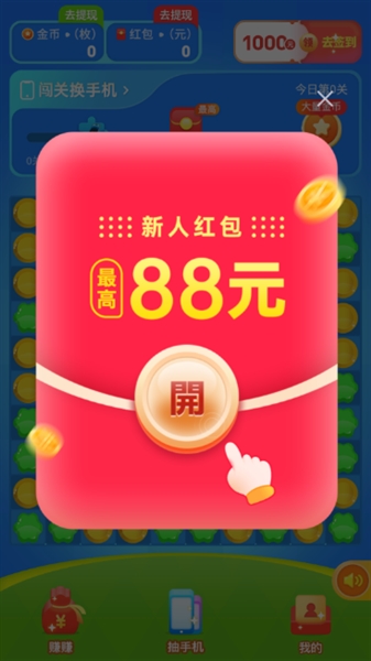 3、开启红包奖励:通关后可获得金币或现金红包,点击开启随机奖励。