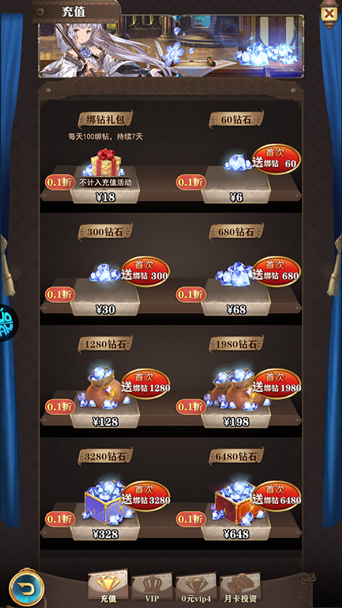 3、游戏内所有充值享受0.1折扣;