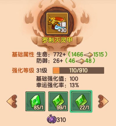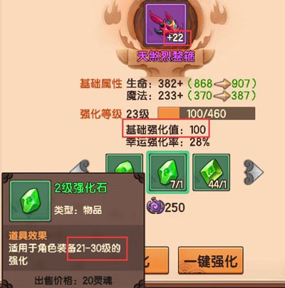 例如1级强化石适用于装备1-20级的强化,2级强化石适用于装备21-30级的强化;