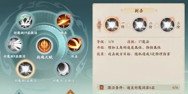 4技能:刺杀,随机目标造成3次伤害。(2阶:刺杀目标优先气血较少,3阶:技能伤害结果增加10%)