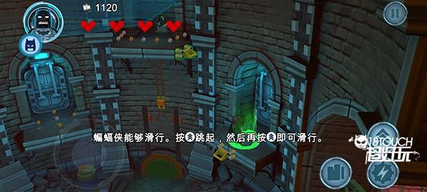 6、另外,蝙蝠侠还可以滑行,点击图示跳跃按钮,连续点击可以从高处滑行下来