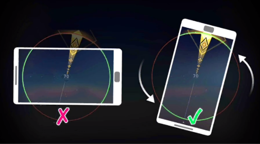 接下来终于要说明旋转手机操作了!在此之前,请先像握着汽车方向盘那样,用双手握着手机,注意不要平放手机,否则将会无法顺利侦测旋转喔 !为了方便旋转操作,我们建议最少抬起手机30度。
