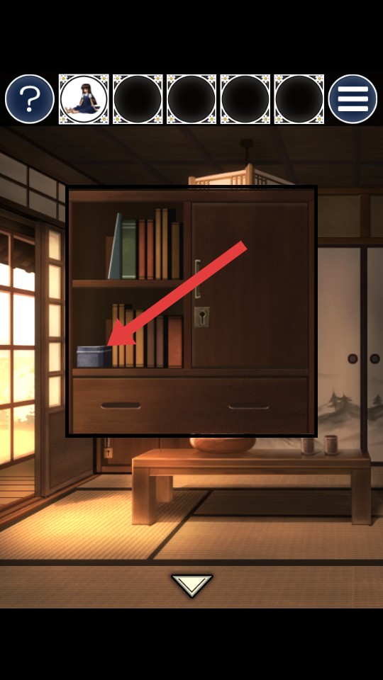 3、放大书架画面后,点击红箭头指向的【蓝色盒子】,查看盒子里是否有对逃脱有帮助的物品。