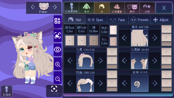 6、在看头发,你可以给头发设置不一样的颜色,还可以弄一个与众不同的发型,其中马尾有236种选项,马尾辫有91种,刘海更是高达338种其它的就更不用说了。