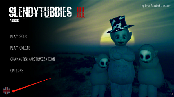 1、进入游戏首页,我们可以看到是英文的,点击左下角的国旗;