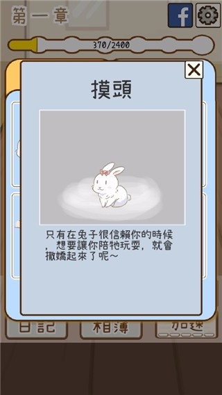 关于兔子的回忆故事,玩家可以跟兔子培养感情,以及回忆,玩法十分的简单,亲和性很强,利用点击可增加与兔子的亲密度,期间亲密度达到一定的值会触发事件;
