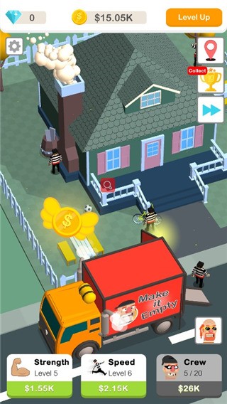 猛男搬家是一款以劫案筹划与团队养成为核心的点击放置模拟游戏。玩家将扮演一名犯罪首脑,核心目标并非亲自行动,而是策略性地培养劫匪团队的能力、规模,并管理庞大的资金。猛男搬家从招募初始船员Crew开始,通过分配资金持续提升团队的力量和速度等核心属性,规划并执行一次次收益更高的劫案,最终实现从街头小贼到犯罪大亨的蜕变。
