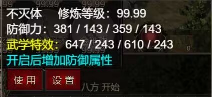 例如:在斗魂页面装备了一个觉醒值为20%的“不灭体”的魔人道袍,在角色页面装备了一个觉醒值为10%的“不灭体”的魔人道袍,则实际不灭体增加的属性值为30%,在武功页面显示的“武学特效”属性也是当前武功属性的30%。