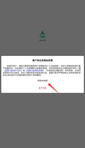 1、启动准星代售APP后,首次使用需阅读并同意用户协议和隐私政策,点击"同意"进入主界面。