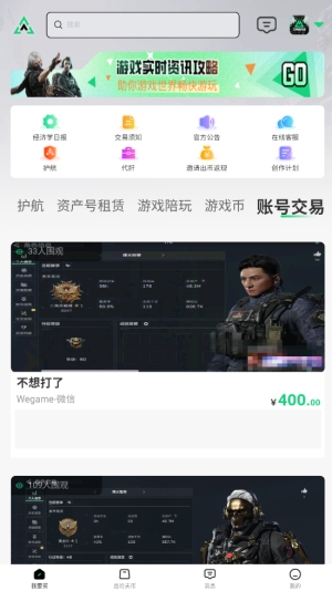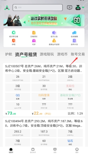 2、在首页选择"账号交易"功能,浏览各类游戏或社交平台账号列表。
