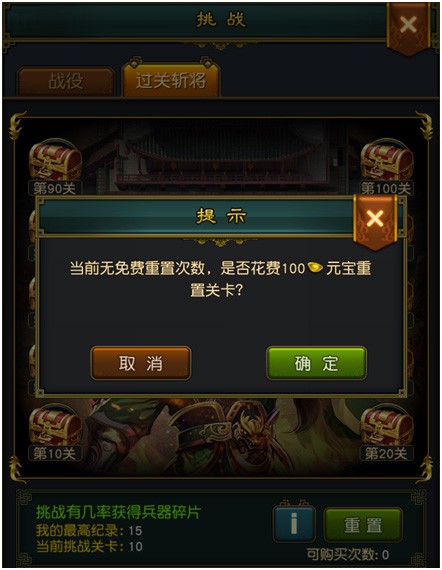 1. 如果玩家觉得当前关卡已无法通过,但是又想继续获得奖励,可以点击“重置”按钮可以重置当前通关进度,从头开始挑战。