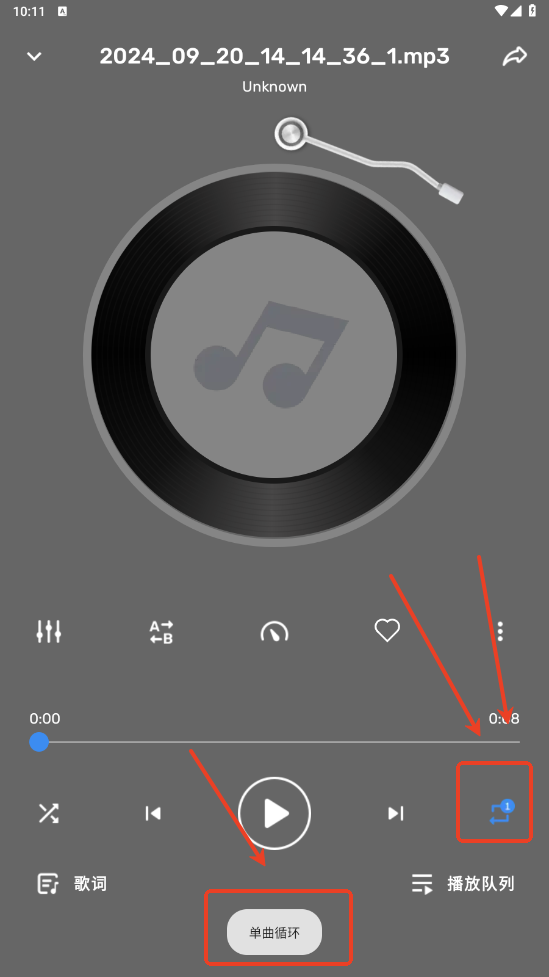2.点击右下角循环按钮。会显示提示:单曲循环/全部循环