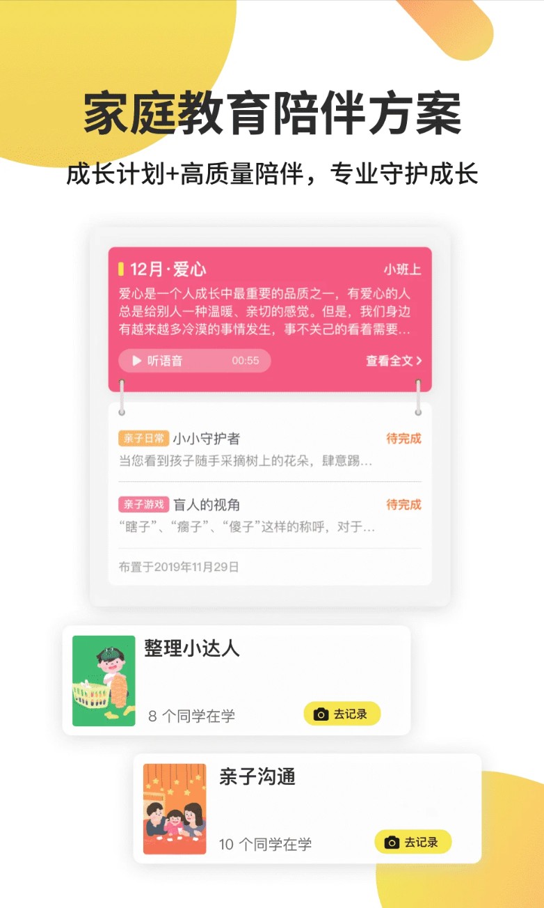 根据3-6岁孩子的发展特点,提供专业的家庭陪伴方案,每周一个活动,涵盖人际交往、情绪管理、习惯养成等各方面,全方位关注宝贝成长。