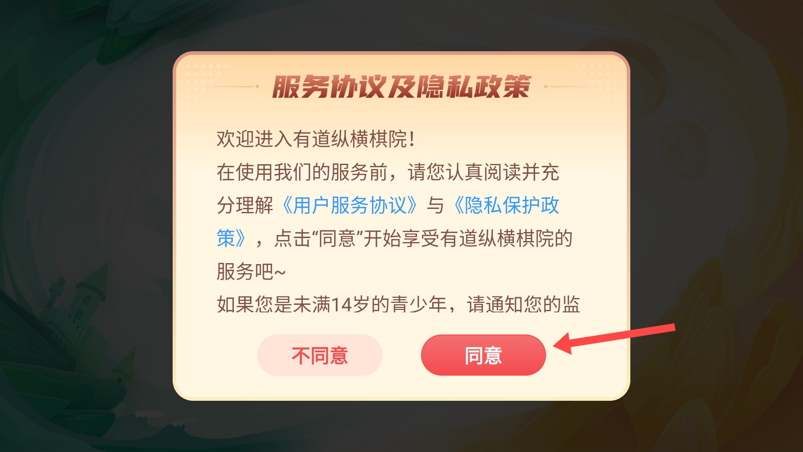 1、进入应用后,会弹出服务协议及隐私政策弹窗,请认真阅读协议相关内容,之后点击同意,方可继续使用有道纵横棋院的服务。
