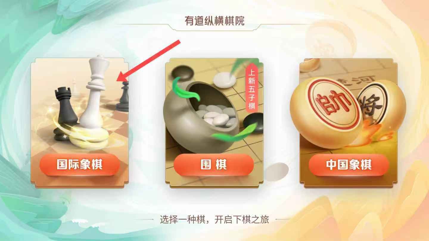 2、在棋类选择界面,能看到国际象棋、围棋、中国象棋等选项,按需点击如国际象棋按钮,即可进入对应棋类界面,开启下棋之旅。
