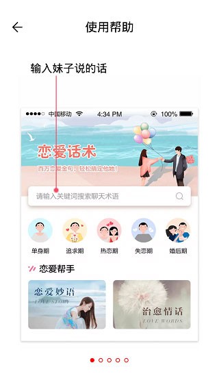 恋爱聊天话术库app是一款简单易用的撩妹必备神器,它是众多男性的救命稻草。它是一款实时聊天回复、传授恋爱技巧、情感咨询挽回感情的恋爱话术聊天神器。从搭讪计划、初建关系、风趣话题、走心话题、建立情感、约会流程、亲密接触到确定关系,一步一步,恋爱聊天话术库app都在为你的幸福而不懈努力。