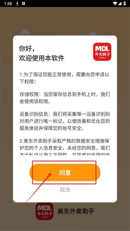 打开美东外卖助手APP,输入账号信息并登录。
