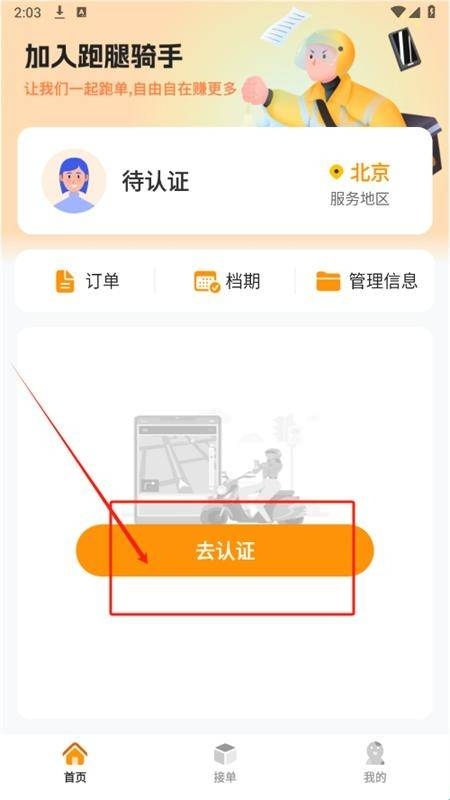 5、需要进行认证才能开始接单,点击“去认证”完成认证流程。