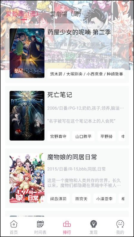 3、在排行榜界面下,我们能够看到动漫、剧场每周的实时排行榜,可以帮助我们做好相应的追番计划。