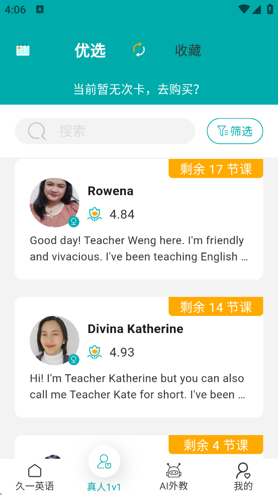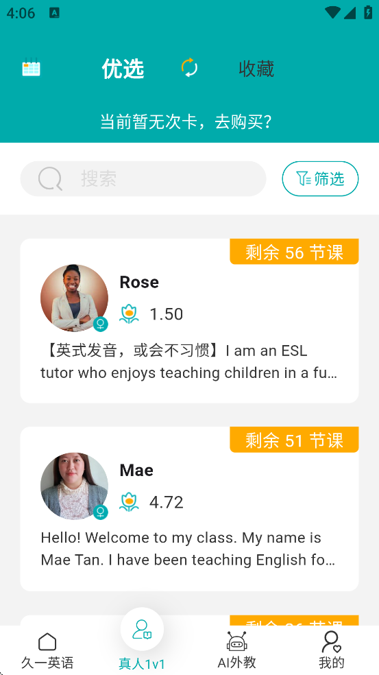 平台提供来自北美、欧洲、菲律宾的外教,可查看其教学经验、资格证书、学生评价等详细资料进行筛选。