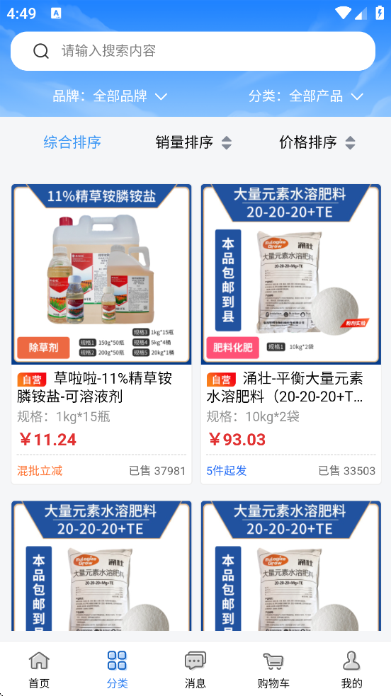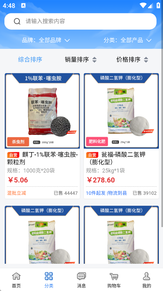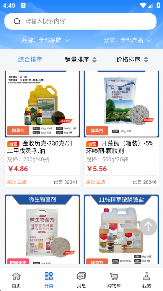 抢农资网app官方下载安装正版是一款购物软件,软件内为用户提供丰富的农药产品信息,用户可以通过软件快速加购需要的商品,一键下单,包邮送到家,同时软件内价格优惠,品质保障,更多惊喜等你来,如此实用的购物软件,欢迎有需求的用户前来下载使用!