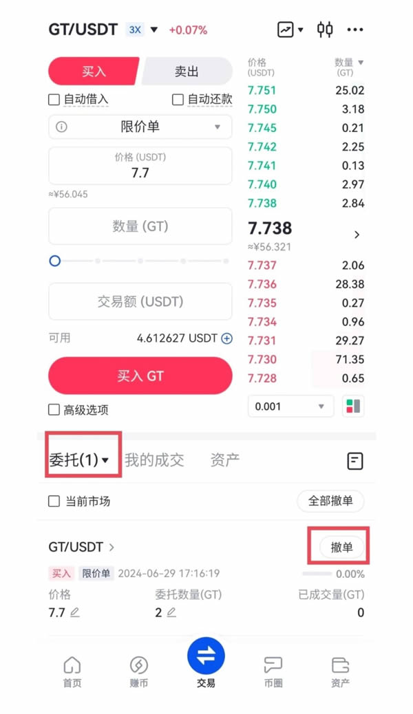 6.下单成功后,如未成交可在交易页面下方的“当前委托”中查看挂单情况,如需撤销也可以点击当前挂单后面的“撤单”撤销该笔订单。